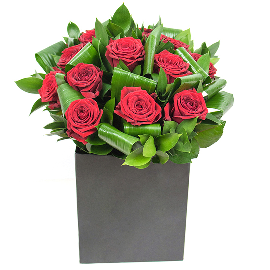 Celebrate life’s special moments with our vibrant arrangement of deep red roses, accompanied by lush aspidistra leaves and elegant ruscus. Designed to captivate and adorn, this bouquet brings a touch of luxury and passion to any space.